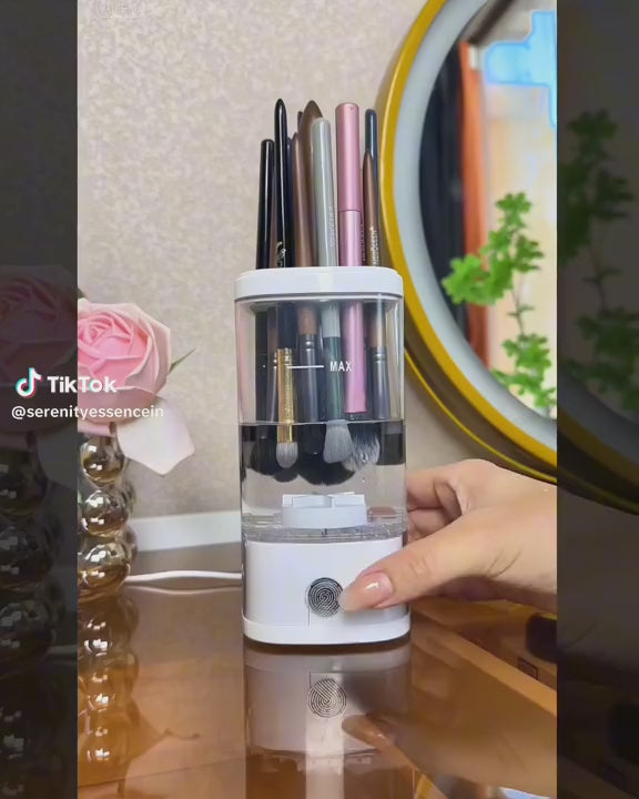 Instruktioner: Anslut din sminkborste, fyll med vatten och rengöringsmedel, slå på enheten och låt den göra jobbet. Borstarna blir snabbt rena och gör om att användas igen.